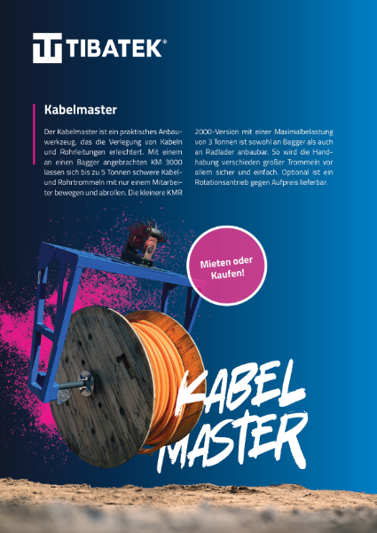 Der Kabelmaster ist ein praktisches Anbauwerkzeug, das die Verlegung von Kabeln und Rohrleitungen erleichtert. Mit einem an einen Bagger angebrachten KM 3000 lassen sich bis zu 5 Tonnen schwere Kabel- und Rohrtrommeln mit nur einem Mitarbeiter bewegen und abrollen. Die kleinere KMR 2000-Version mit einer Maximalbelastung von 3 Tonnen ist sowohl an Bagger als auch an Radlader anbaubar. So wird die Handhabung verschieden großer Trommeln vor allem sicher und einfach. Optional ist ein Rotationsantrieb gegen Aufpreis lieferbar.